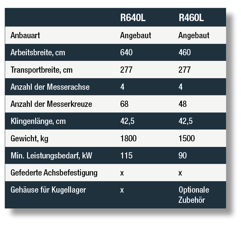 In der R-Serie sind die Schaufelwalzen als Anbauwerkzeug erhältlich. Die Schaufelwalze ist mit Vier-Klingen-Messerkreuzen ausgestattet. Die Spaten (Klingen) brechen, zerkleinern, mischen und bewegen den Boden. Gleichzeitig kann sich die Bodenmasse seitlich frei bewegen, es kommt zu keinem Verdichtungseffekt.