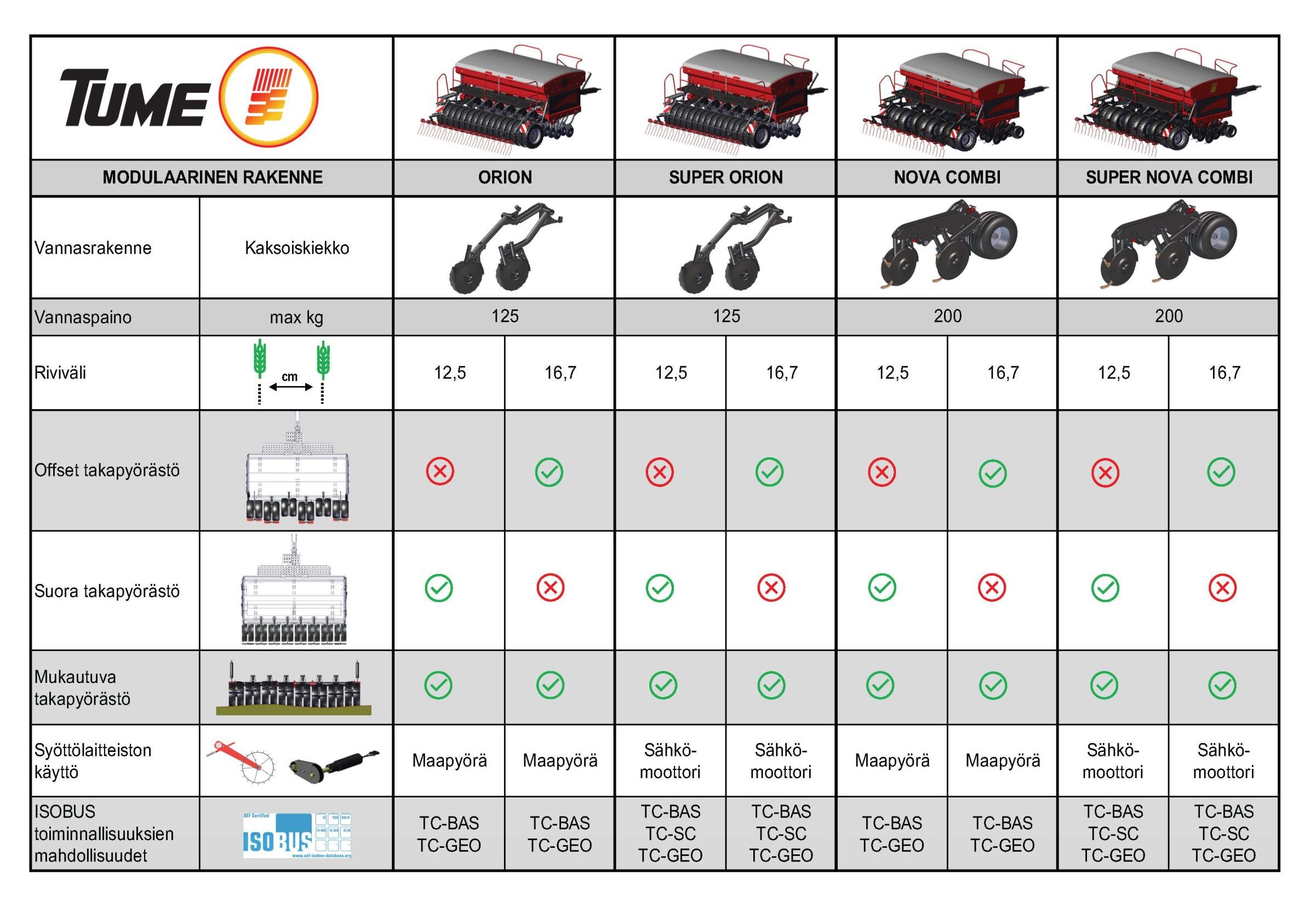 Tumen uusittu modulaarinen mallisto luo käyttäjälle entisestään uusia vaihtoehtoja. Tumen isoimmat 3- ja 4-metriset mallit ovat uusittu siten, että koneen ostajan on mahdollista valita koneiden eri malleihin joko 16,7cm tai 12,5cm riviväli, mekaaninen tai sähköinen syöttö sekä ohjainlaitteeksi täsmäviljelyyn soveltuva ISOBUS varustelu tai vastaavasti yksinkertainen ohjaus ilman ajotietokonetta. Tämä tuo ostajalle hirmuisesti uusia vaihtoehtoja, kun nyt on saatavilla esimerkiksi ilman ajotietokonetta toimiva Nova Combi 16,7cm rivivälillä, tai sähkösyötöllä toimiva Super Nova Combi myös 12,5 rivivälillä tai myös uutena tuleva Super Orion, jossa mahdollista saada sähkösyötöllä varustettu kone pykälää kevyemmällä vantaistolla joko 16,7 tai 12,5cm rivivälille.