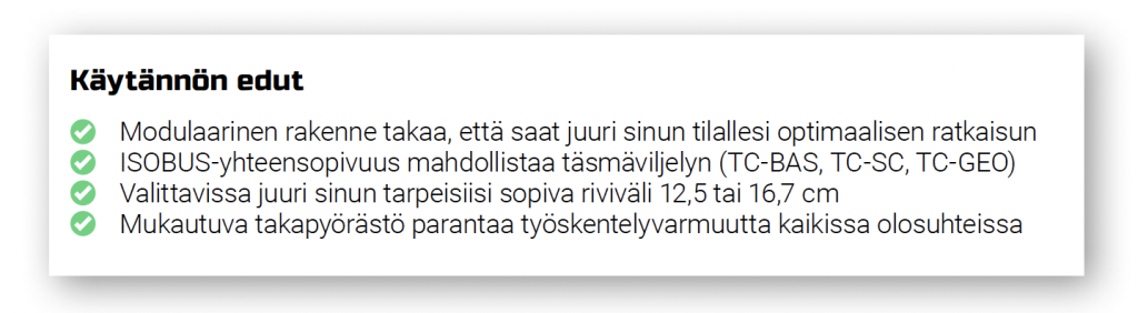 Tumen uusittu modulaarinen mallisto luo käyttäjälle entisestään uusia vaihtoehtoja. Tumen isoimmat 3- ja 4-metriset mallit ovat uusittu siten, että koneen ostajan on mahdollista valita koneiden eri malleihin joko 16,7cm tai 12,5cm riviväli, mekaaninen tai sähköinen syöttö sekä ohjainlaitteeksi täsmäviljelyyn soveltuva ISOBUS varustelu tai vastaavasti yksinkertainen ohjaus ilman ajotietokonetta. Tämä tuo ostajalle hirmuisesti uusia vaihtoehtoja, kun nyt on saatavilla esimerkiksi ilman ajotietokonetta toimiva Nova Combi 16,7cm rivivälillä, tai sähkösyötöllä toimiva Super Nova Combi myös 12,5 rivivälillä tai myös uutena tuleva Super Orion, jossa mahdollista saada sähkösyötöllä varustettu kone pykälää kevyemmällä vantaistolla joko 16,7 tai 12,5cm rivivälille.